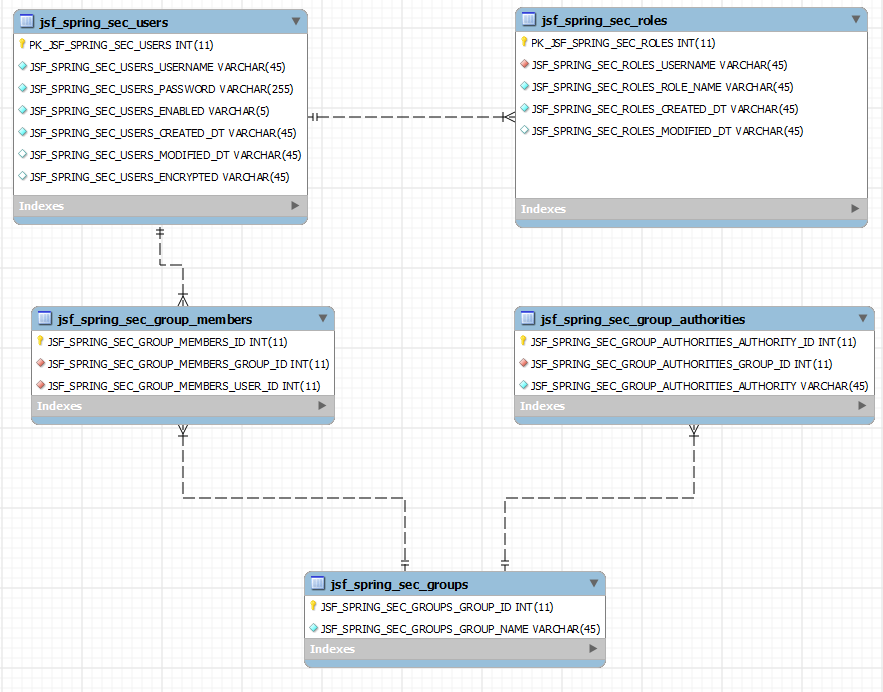 JdbcDaoImpl of Spring Security needs three queries in order to fetch the required information correctly, namely usersByUsernameQuery, authoritiesByUsernameQuery and groupAuthoritiesByUsernameQuery. In our previous examples we were not using Group-Based access control hence we didn’t define groupAuthoritiesByUsernameQuery. Updated Schema is below, note we have not deleted JSF_SPRING_SEC_ROLES table but in this version of application we ain’t using it.