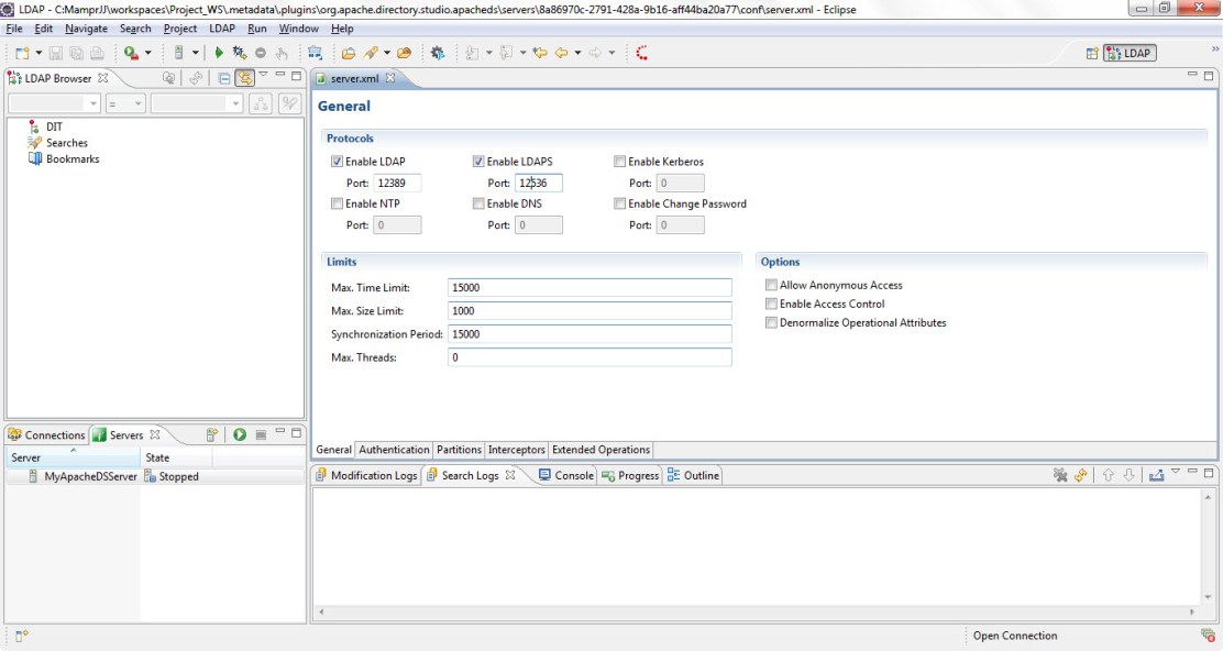 Sixth Double click on your server, this should open server.xml which is the configuration file, change port number of LDAP and LDAPS (since 10389 and 10636 is default port and is used by default server which is part of Apache DS installation).