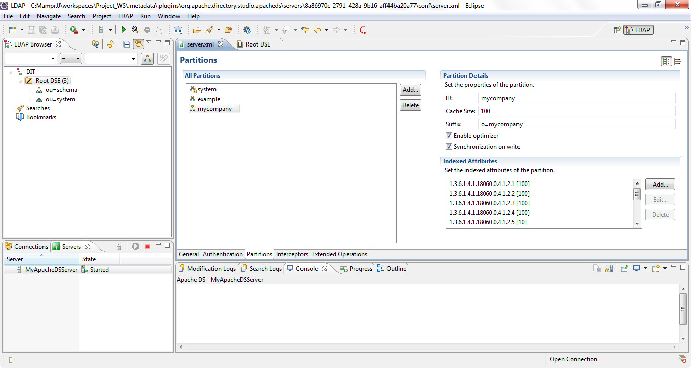 Eigth Now we will create an organization struture inside our LDAP Server, for that again Double Click on your server this will open up server.xml, in the tabbed pane choose Partitions. Click on Add and provide ID = mycompany, Cache Size = 100 and suffix = o=mycompany